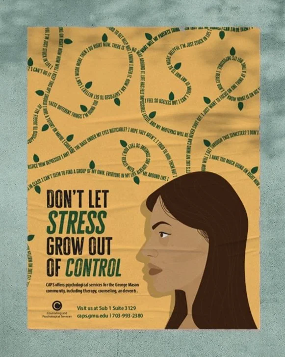 This project focused on designing an advertisement for Counseling and Psychological Services (CAPS) at George Mason University. This advertisement’s Target Audience is the student body of George Mason University, specifically the ones attending classes on the Fairfax Campus who might not know about CAPS. The main goal of this ad is not to directly state every services CAPS offers, but to encourage students to look into CAPS further by accessing their website, calling on the phone, or visiting their office. After researching the wide variety of services Playing around with the idea of feeling out of control, I wanted to create a narrative that could apply to many different aspects of a person’s life, not just one issue in particular. This lead to developing the idea of a mind “growing” out of control with life’s stresses and obstacles, with the simple message: "Don’t let stress grow out of control.”
